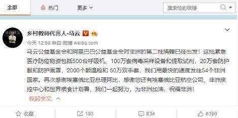 4 月 6 日,馬云再次發(fā)布微博表示,馬云公益基金會和阿里巴巴公益基金會對非洲的第二批捐贈已經(jīng)出發(fā)!這批緊急醫(yī)療防疫物資包括 500 臺呼吸機、100 萬套病毒采樣設(shè)備和提取試劑,20 萬套防護服和防護面罩,2000 個額溫槍和 50 萬雙手套,我們用最快的速度發(fā)往 54 個非洲國家。