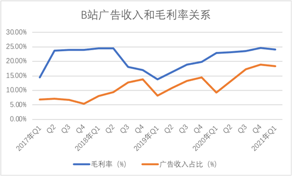 其原理是比較容易理解的,相較于直播業務下平臺需要與主播分傭,游戲業務的目標用戶群又相對較窄,且研發以及競爭壓力也相對較大,廣告這一互聯網業最古老的商業模式的價值開始在B站顯現,借廣告這一高成長及低成本模式,B站得以改善毛利率。