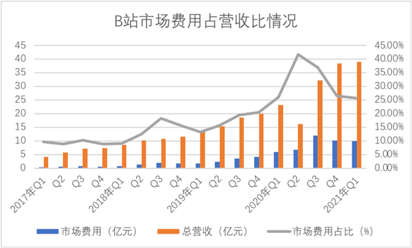 B站與2018年Q1赴美上市,當年通過發行普通股共募集現金接近50億元,在資本市場充實現金之后,當季市場費用占應收比就開始增長,但在2019年之后(準確說是下半年開始),市場費用占應收比才陡然增加,也就是說,在上市之初,雖然募集到了資金,但企業在市場費用的花費中仍不激進,直到2019年下半年開始。