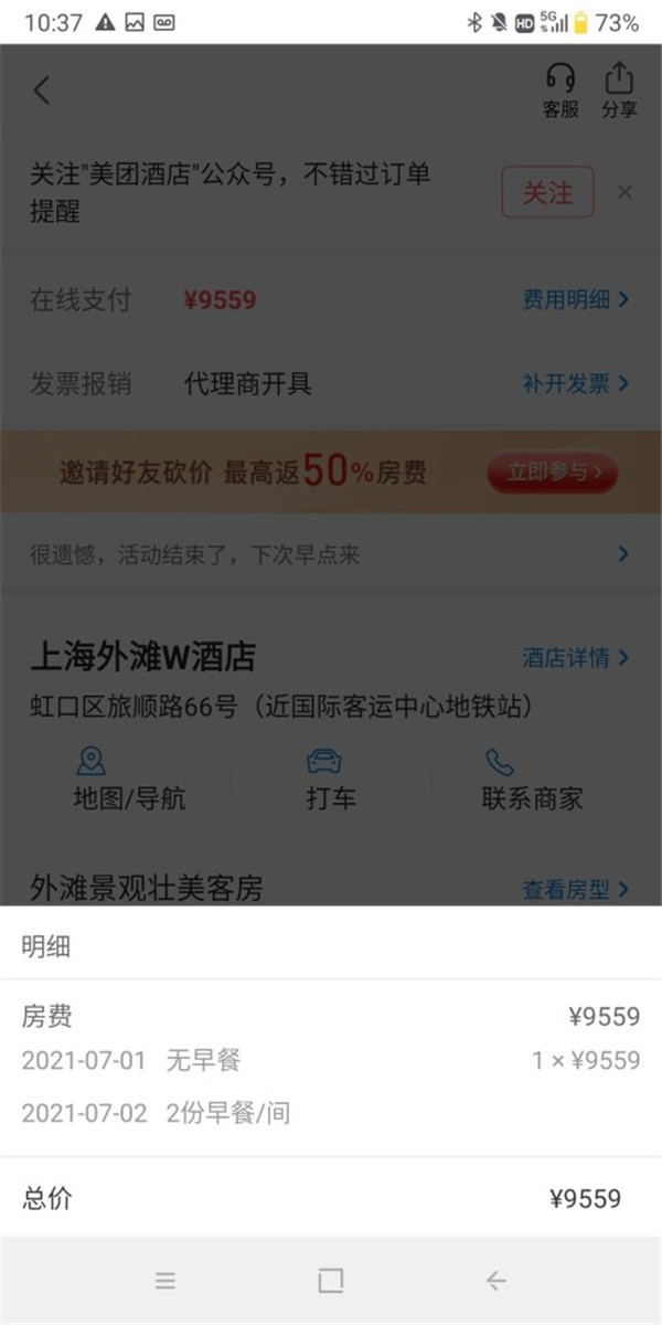 7月1日,帶著娃前來上海旅游的俞先生(化名)在美團平臺預訂了一間當晚入住上海外灘W酒店一晚的客房,房型顯示為46平方米的外灘景觀壯美客房,價格9559元(人民幣,下同)一晚。
