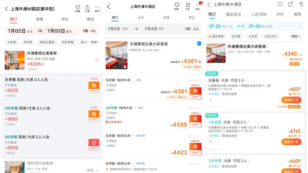 7月2日上午顯示的上海外灘W酒店外灘景觀壯美客房預訂價格截圖,從左至右分別為:美團、攜程、去哪兒。
