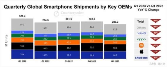 Counterpoint 公布的數(shù)據(jù)顯示,Q1 手機銷量 TOP5 品牌為三星、蘋果、小米、OPPO 和 vivo,對應(yīng)的出貨量和降幅分別為 (三星)6060 萬部、同比下降 19%,(蘋果)5800 萬部、同比下降2%,(小米)3050 萬部、同比下降 22%,(OPPO)2800 萬部、同比下降 10%,(vivo)2080 萬部,同比下降 18%。全球智能手機市場整體出貨量為 2.802 億部,同比下降 14%。