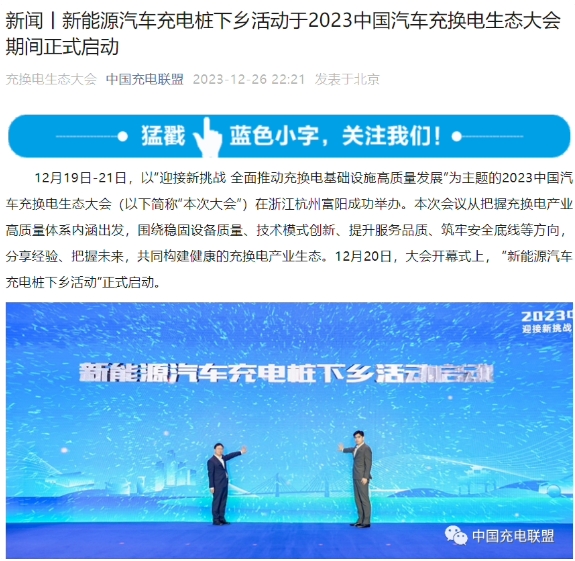 在近日舉辦的 2023 中國汽車充換電生態大會上,“新能源汽車充電樁下鄉活動”正式啟動。