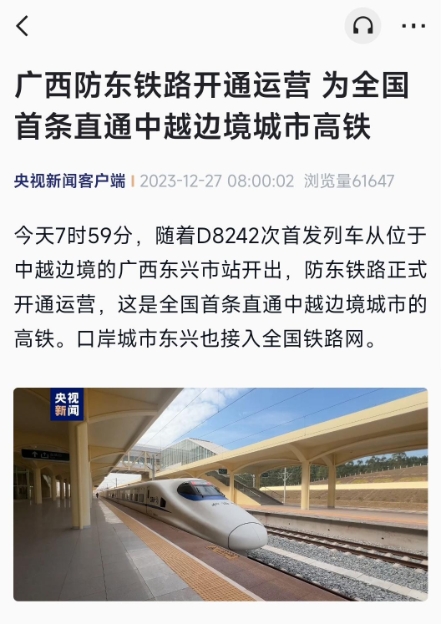據央視新聞消息,今天 7 時 59 分,隨著 D8242 次首發列車從位于中越邊境的廣西東興市站開出,防東鐵路正式開通運營,這是全國首條直通中越邊境城市的高鐵。口岸城市東興也接入全國鐵路網。