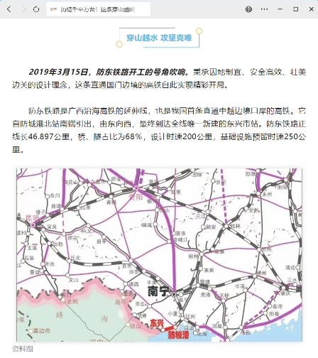 防東鐵路位于廣西防城港市境內,起自既有欽州至防城港高鐵的防城港北站,終至新建的東興市站,線路全長 47 公里,設計時速 200 公里,全線共設防城港北站、東興市站兩座車站,為國鐵 I 級雙線客貨共線鐵路。