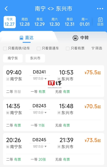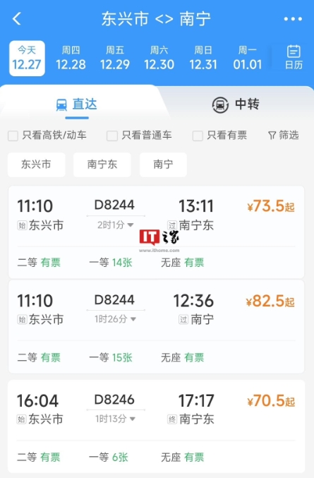 南寧到東興的票價為 70.5 元起,分別在上午、下午、晚上各有一趟列車。