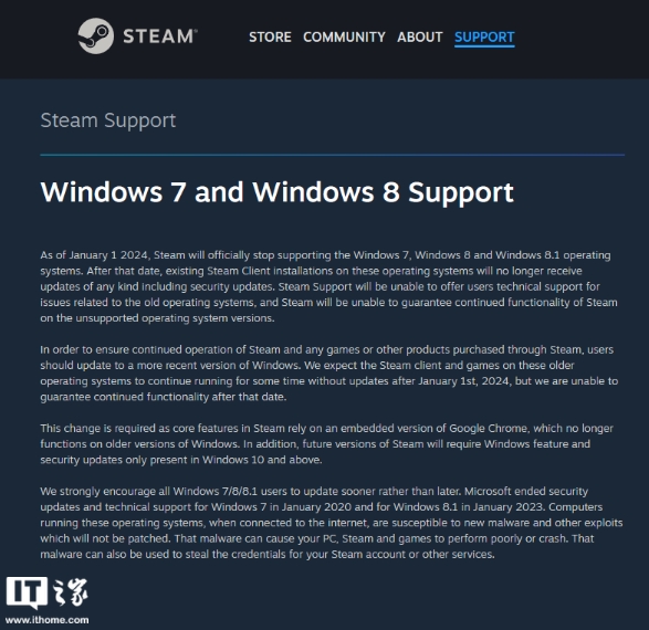 距離 2024 年的元旦,已經不到一個星期了。Steam 日前通過官方支持頁面發布通知:自 2024 年 1 月 1 日起,Steam 將正式停止支持 Windows 7、Windows 8 和 Windows 8.1 操作系統。