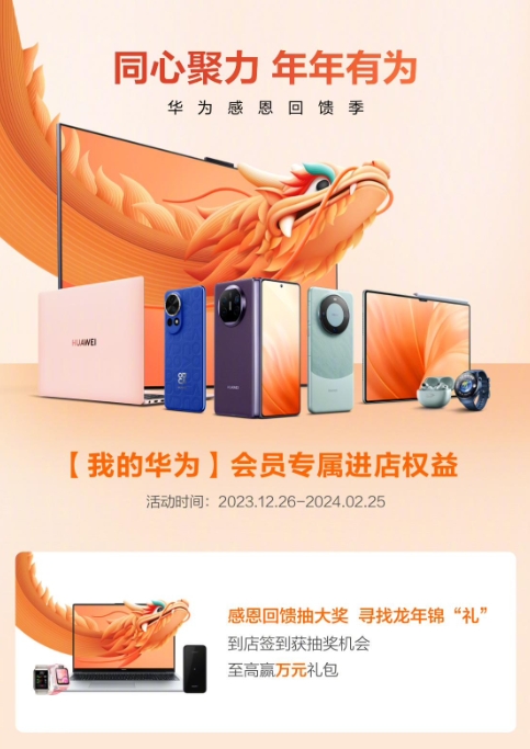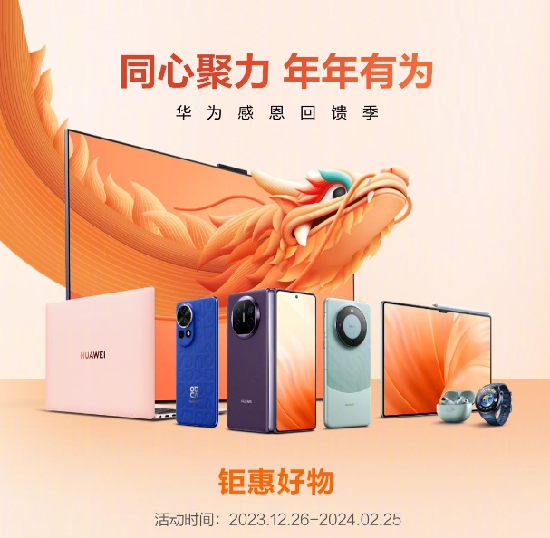華為開啟感恩回饋季,電腦、平板、智慧屏等產品至高優惠 2000 元;服務門店同步開啟備件 8.8 折等,活動時間 2023 年 12 月 26 日-2024 年 2 月 25 日。