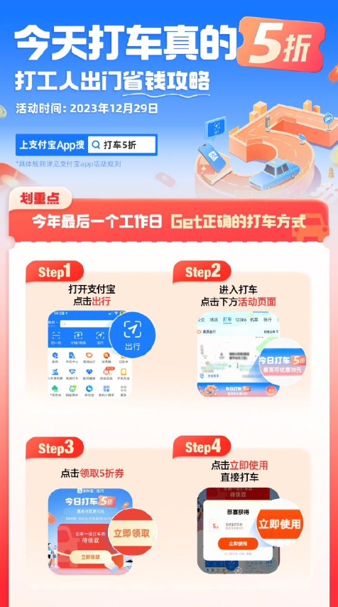 2023 最后一個(gè)工作日,支付寶推出“打車 5 折”活動(dòng) 09:45:03