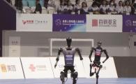 國家速滑館西南側的人形機器人賽訓基地熊貓眼燈光明亮,5V5足球比賽在此舉行。 吳 凡攝(人民視覺) 5V5足球比賽現場,人形